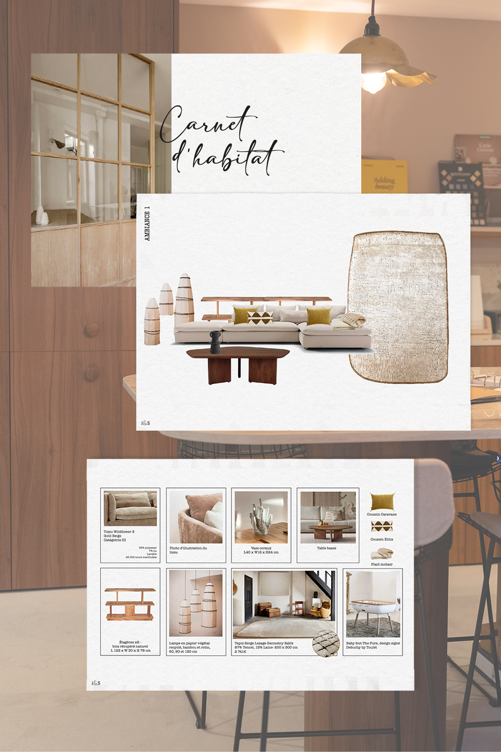 La présentation du carnet d’habitat se fait en boutique, vous permettant de découvrir les couleurs, matières, tissus, papiers peints et mobilier auxquels nous avons pensé pour votre projet.